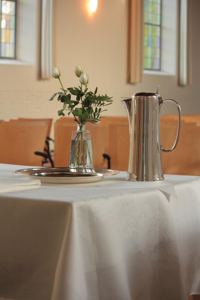 Dankzij de inspanningen van de activiteitencommissie hebben wij in november 2014 nieuw linnen voor de Avondmaalstafel kunnen aanschaffen. In dit prachtig geweven linnen is een diagonaal patroon van druivenranken opgenomen.